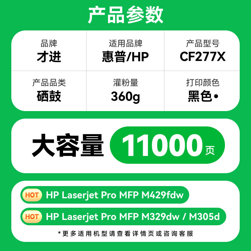 商品名称: 才进cf277a硒鼓适用惠普m329dw硒鼓m429dw M429fdw/fdn碳粉M305d M405d墨粉M405dn/dw 77a打印机墨盒LaserJet 硒鼓 CF277A 带芯片 大容量版/支