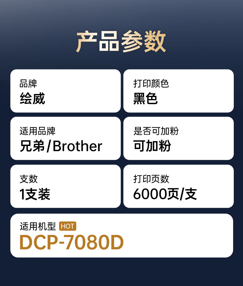 • 商品名称:绘威DCP-7080D粉盒适用兄弟7080D打印机硒鼓 dcp7080d专用粉盒硒鼓brother墨盒7080D墨粉7080硒鼓 墨粉盒 DCP-7080D/盒