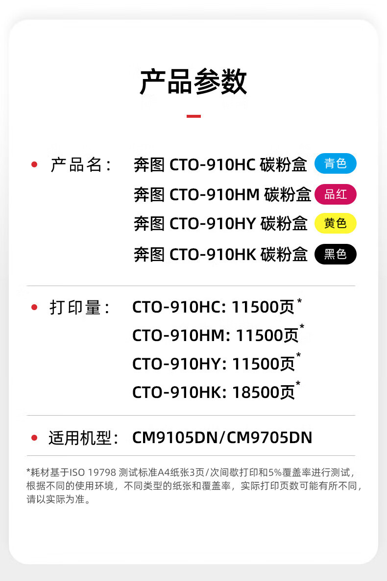 • 商品名称:奔图(PANTUM)CTO-910HKCMY原装黑红黄青四色碳粉墨粉盒套装(适用CM9105DN/CM9705DN打印机)黑色18500页/彩色11500页 耗材/套