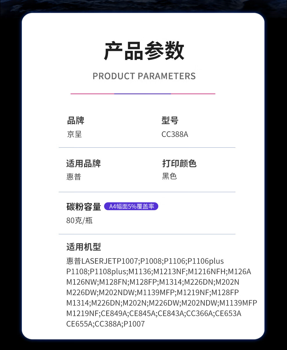 • 商品名称:京呈388A硒鼓适用惠普m1136 m126a P1108 P1008 P1106 P1007 m1213nf m126nw m1218nfs m128fn/fp/fw 88a碳粉 CC388A/瓶
