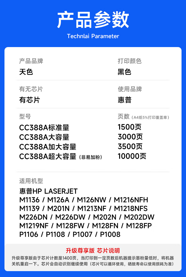 • 商品名称:天色388a硒鼓适用惠普m1136 m126a m126nw墨盒hp1136 126a p1108 p1106硒鼓m128fn打印机墨粉盒 88A大容量硒鼓2支装/个