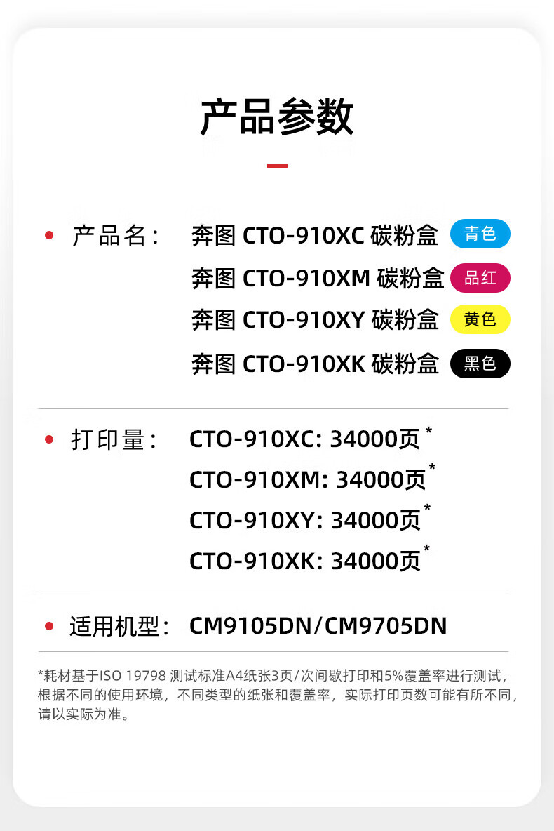 包装清单: CTO-910XK粉盒*1、CTO-910XC粉盒*1 CTO-910XM粉盒*1/CTO-910XY粉盒*1