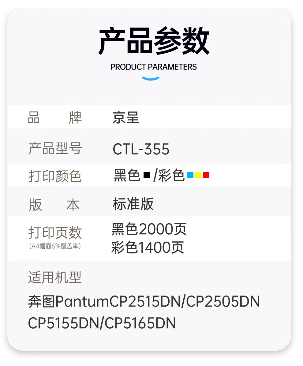 • 商品名称:京呈CTL-355粉盒适用奔图(PANTUM)CP2515DN CP2505DN CP5155DN CP5165DN打印机墨盒硒鼓碳粉盒 标容四色套装 CTL-355/支