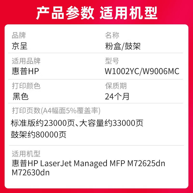 • 商品名称:京呈W1002YC适用惠普HP LaserJet MFP M72625dn M72630dn硒鼓粉盒 W9006MC 原装再生成像鼓/鼓架/感光鼓80000页 W1002YC/支
