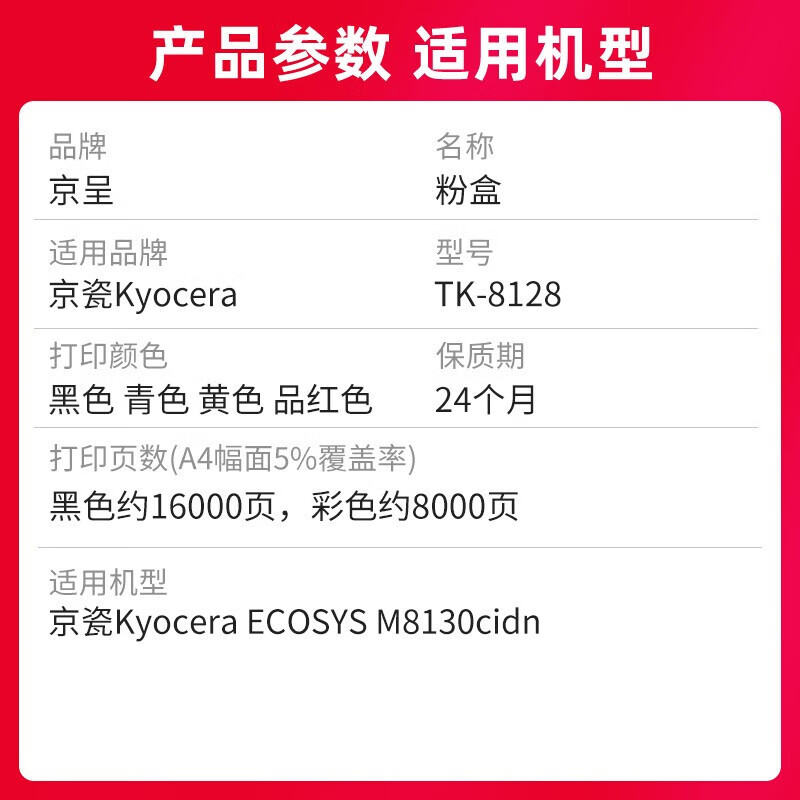 • 商品名称:京呈适用京瓷TK-8128粉盒ECOSYS M8130cidn墨粉盒京瓷M8130CIDN打印机碳粉 TK-8128大容量四色粉盒套装 40000页 TK-8128/套