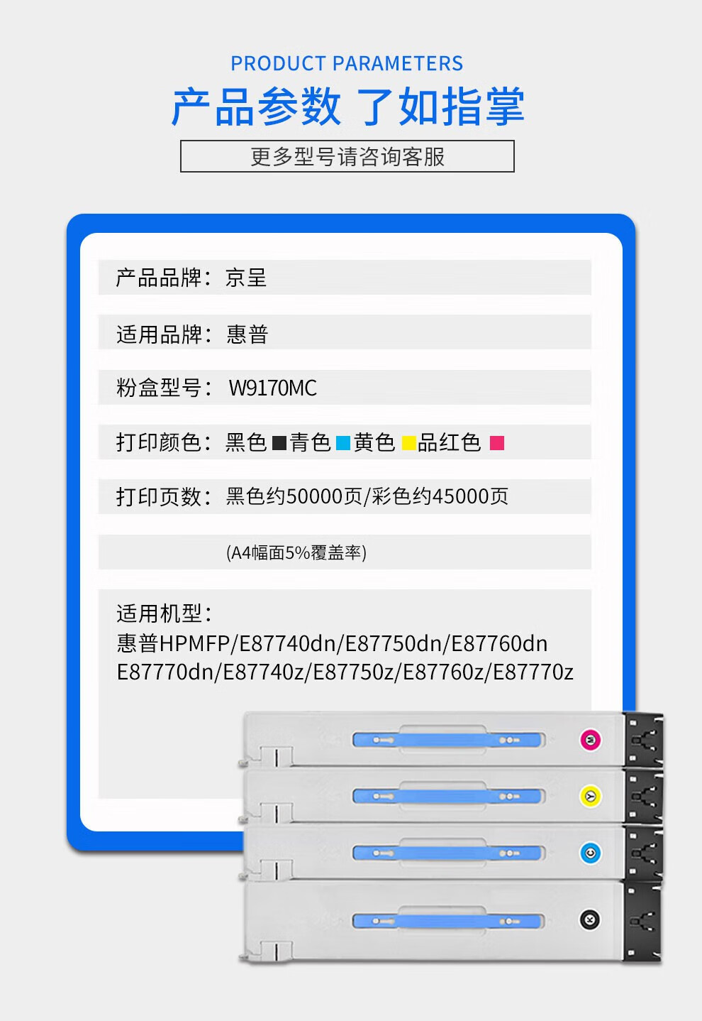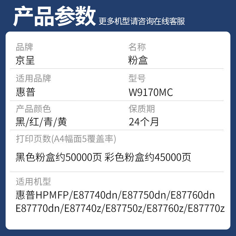商品名称: 京呈W9170MC粉盒适用HP惠普E87740dn/87750dn/87760dn/E87770z 【185000页】W9170MC 四色粉盒套装 W9170MC/套
