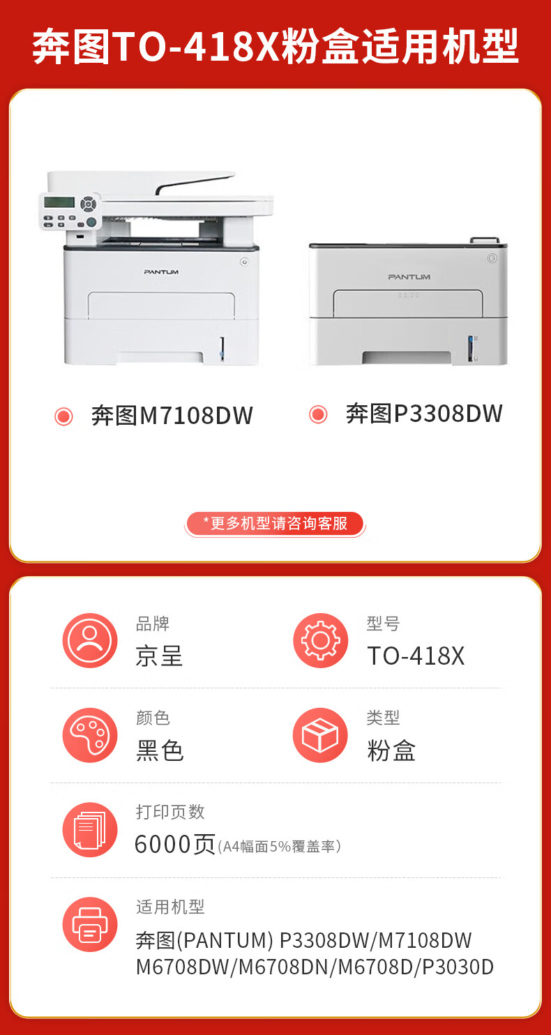 电脑、办公  > 办公耗材  > 硒鼓  >  京呈  >  京呈PLUS版TO-418X适奔图P3308DW M7108DW墨盒M6708DW/DN/D打印机碳【带芯片】TO-418X 大容量粉盒 约6000页 TO-418X /支