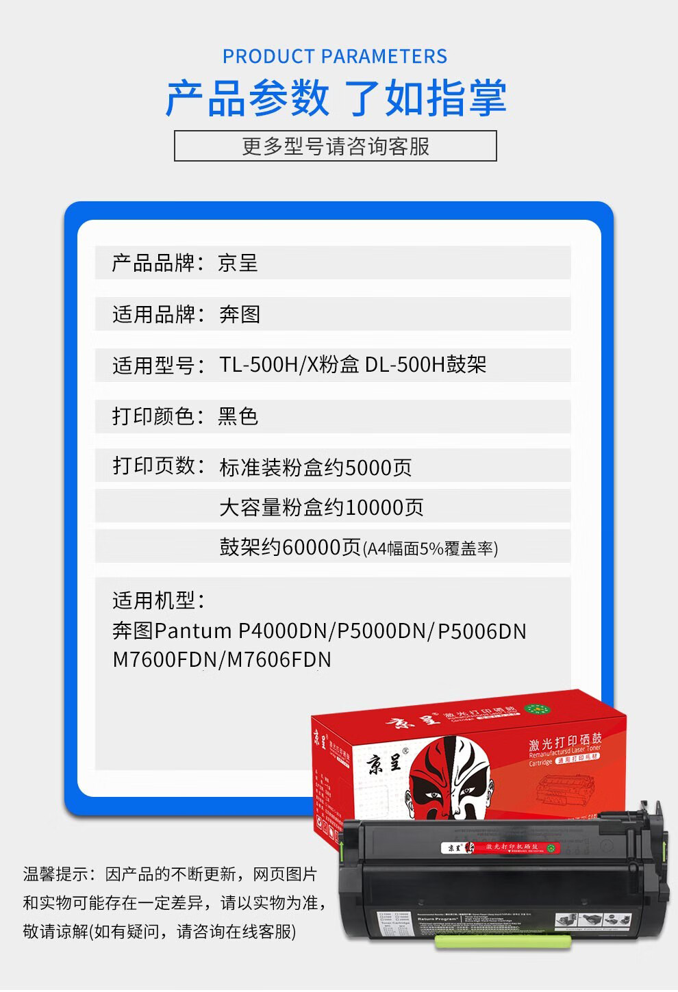 商品名称: 京呈TL-500粉盒适用奔图P5000dn粉盒P4000dn硒鼓TL-500h粉盒P5006DN M7600fdn M7606FDN打印机 全新定影组件 TL-500H/支