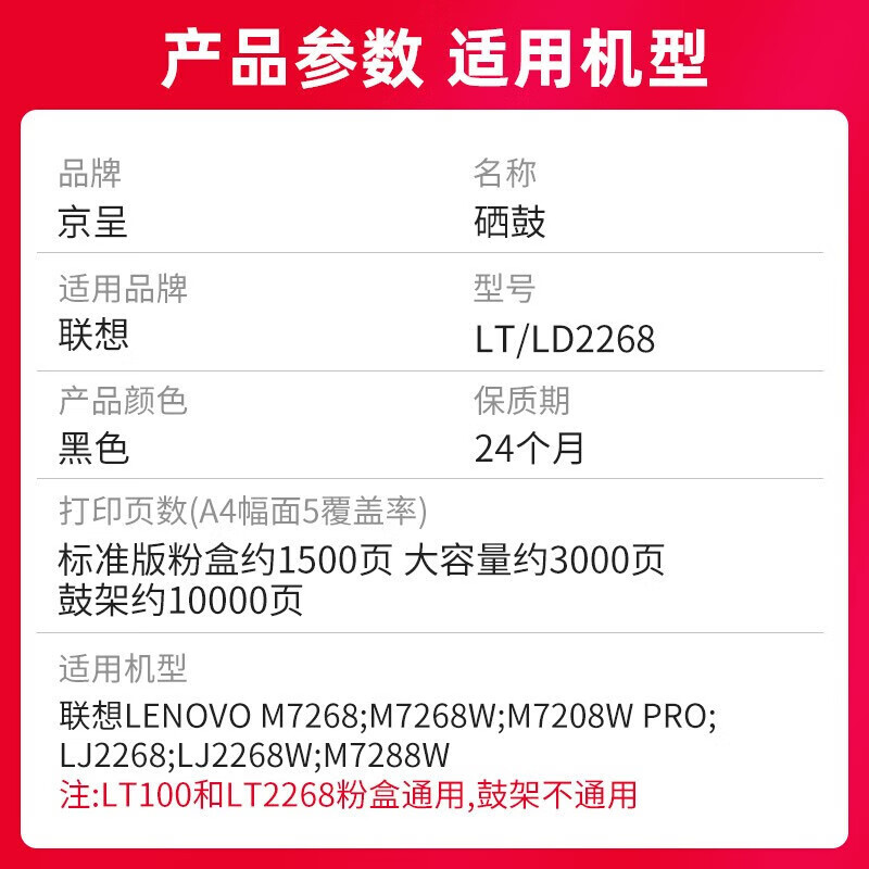 电脑、办公  > 办公耗材  > 硒鼓  >  京呈  >  京呈LT2268墨粉盒适联想LJ2268 LJ2268W M7268W打印机m7288w墨盒7208 【3000页】LT2268大容量粉盒 1支装 LT2268 粉盒/支