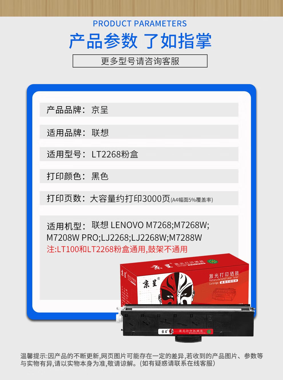 商品名称: 京呈LT2268墨粉盒适联想LJ2268 LJ2268W M7268W打印机m7288w墨盒7208 【3000页】LT2268大容量粉盒 1支装 LT2268 粉盒/支