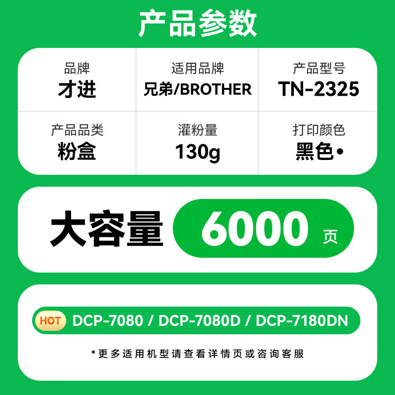 • 商品名称:才进适用兄弟dcp7080d硒鼓7180dn mfc7380激光打印机墨盒tn2325粉盒hl2260d碳粉7480d一体机DR2350鼓架7880DN TN2325/支