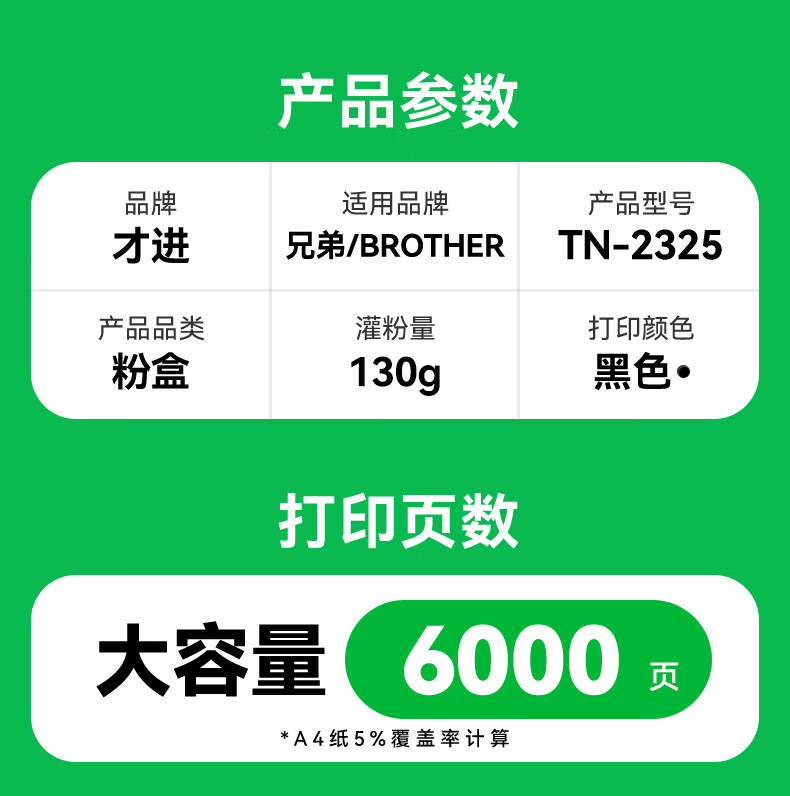 商品名称: 才进适用兄弟dcp7080d硒鼓7180dn mfc7380激光打印机墨盒tn2325粉盒hl2260d碳粉7480d一体机DR2350鼓架7880DN TN2325/支