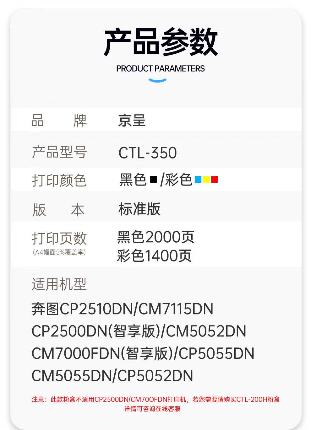 • 商品名称:京呈CTL-350粉盒适奔图CP2500DN CM7000FDN(智享版) CP2510DN CM7115/5055/5052DN CP5055/5052DN打印机硒鼓 CTL-350/套