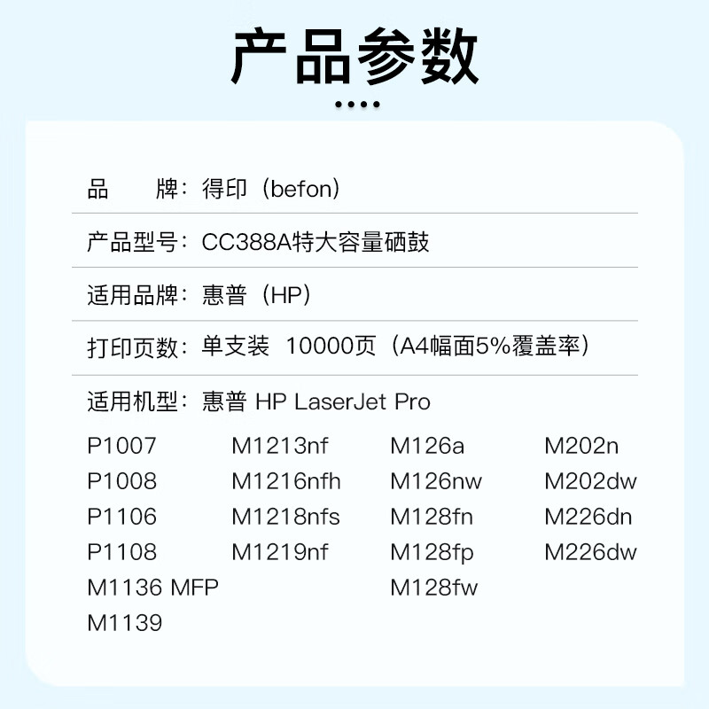 电脑、办公  > 办公耗材  > 硒鼓  >  得印/befon  >  得印388a硒鼓适用惠普m1136硒鼓m126a m126nw p1108 p1106 p1008 p1007 m1213nf 1216nfh打印机墨盒 cc388a硒鼓 BF-C388A/支