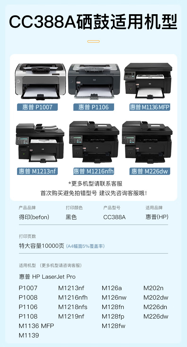 • 商品名称:得印388a硒鼓适用惠普m1136硒鼓m126a m126nw p1108 p1106 p1008 p1007 m1213nf 1216nfh打印机墨盒 cc388a硒鼓 BF-C388A/支