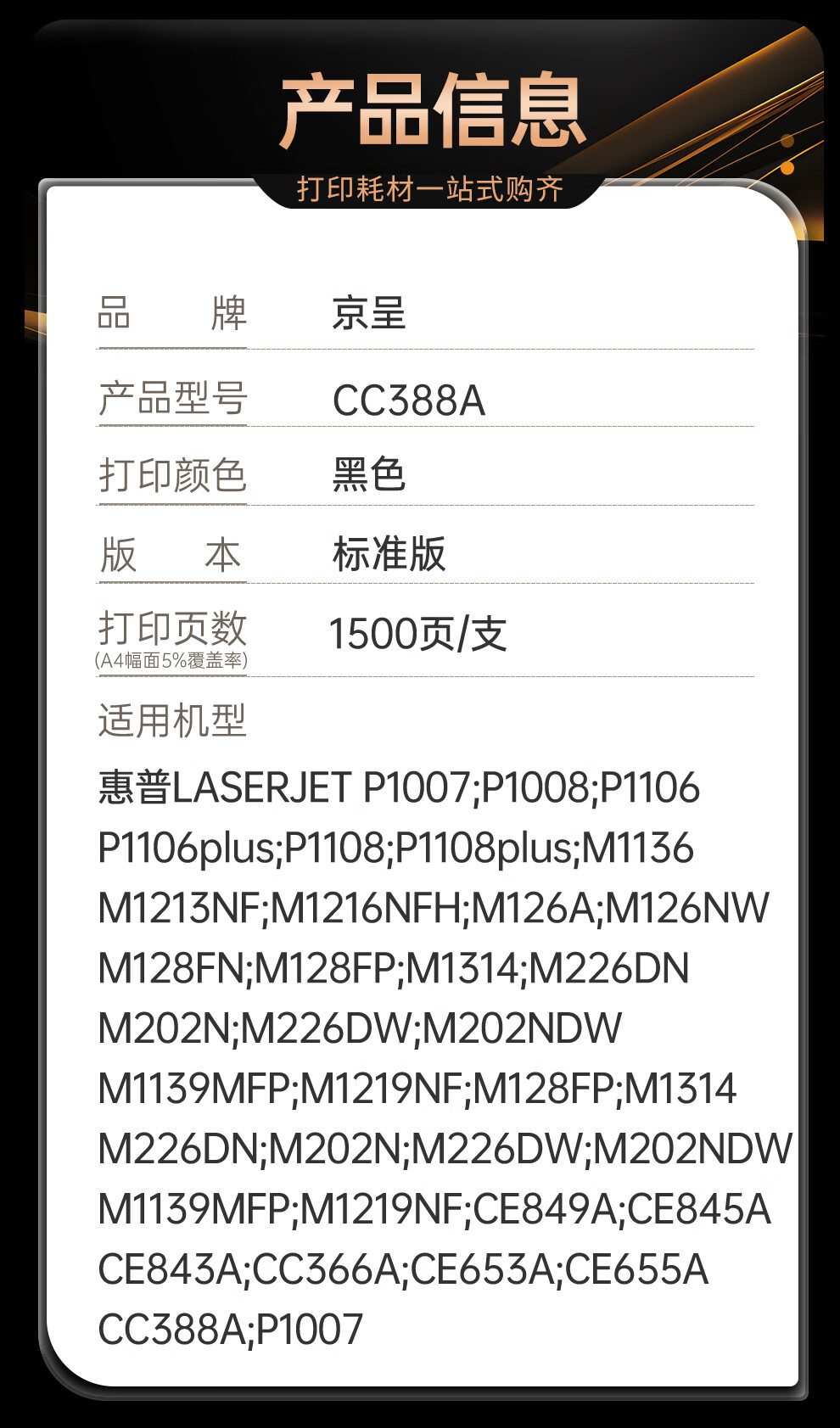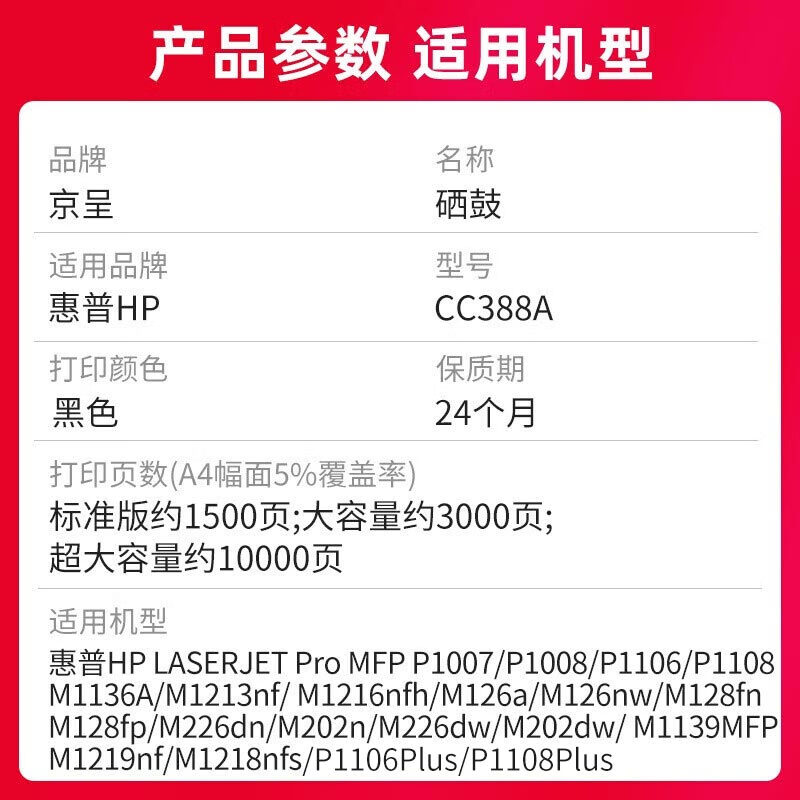 商品名称: 京呈388A硒鼓适用惠普m1136 m126a P1108 P1008 P1106 P1007 m1213nf m126nw m1218nfs m128fn/fp/fw 1500页 CC388A/支