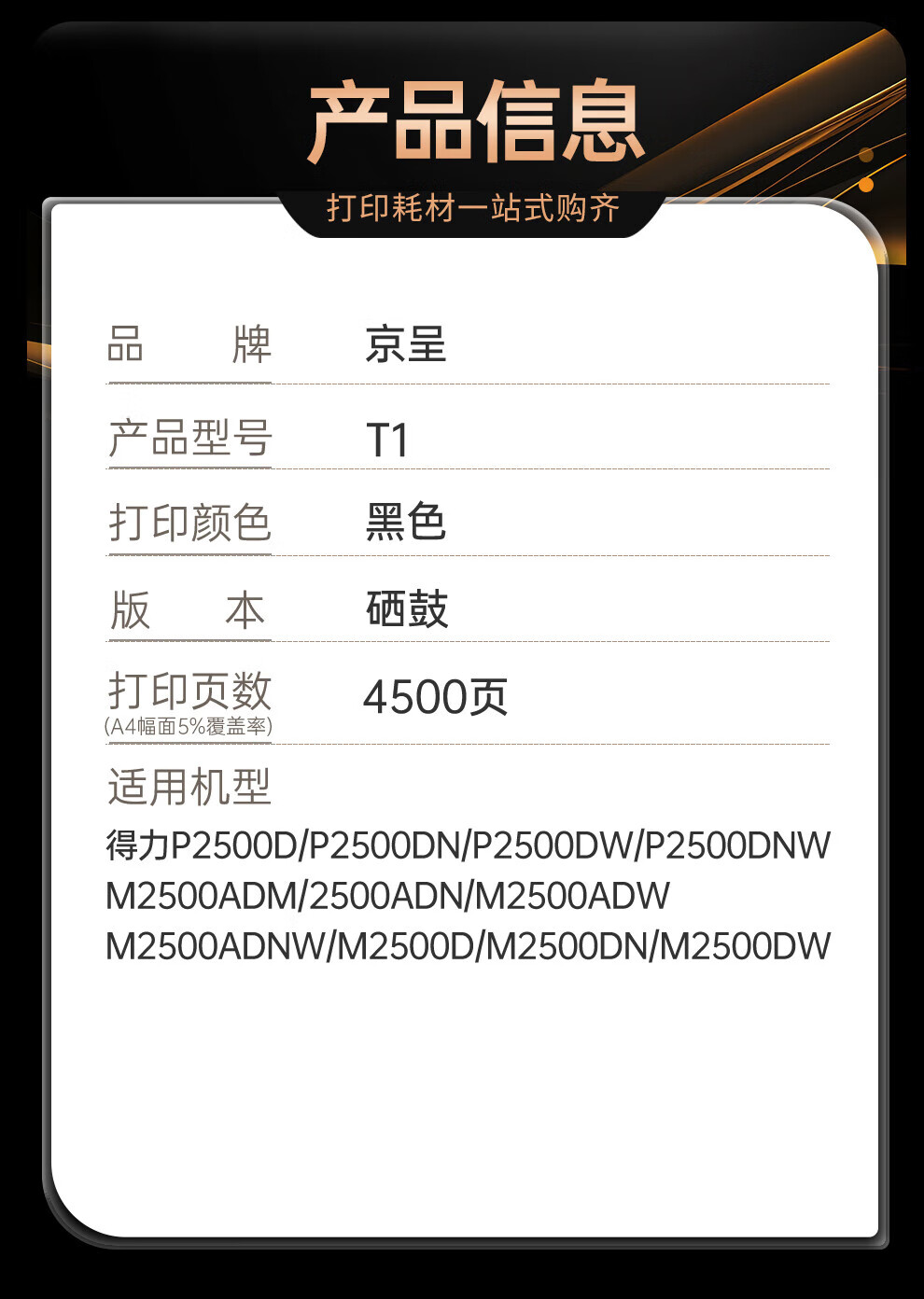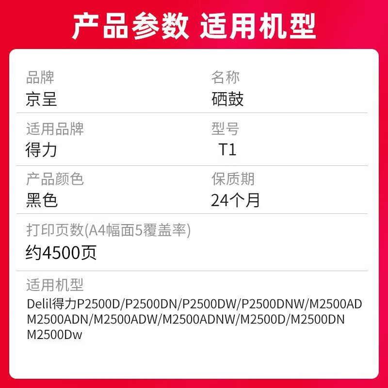 商品名称: 京呈T1硒鼓得力M2500dn硒鼓适用得力P2500D/DN/DW/DNW M2500D/DN/DW/ADNW/M2300ADW打印机粉盒M2800ADN/M2800ADNW T1/支