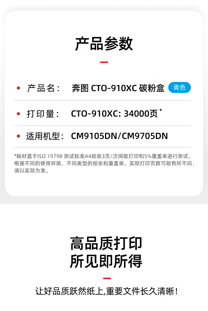 • 商品名称:奔图(PANTUM)CTO-910XC原装青色高容量碳粉墨粉盒(适用CM9105DN/CM9705DN打印机)印量34000页 耗材/支