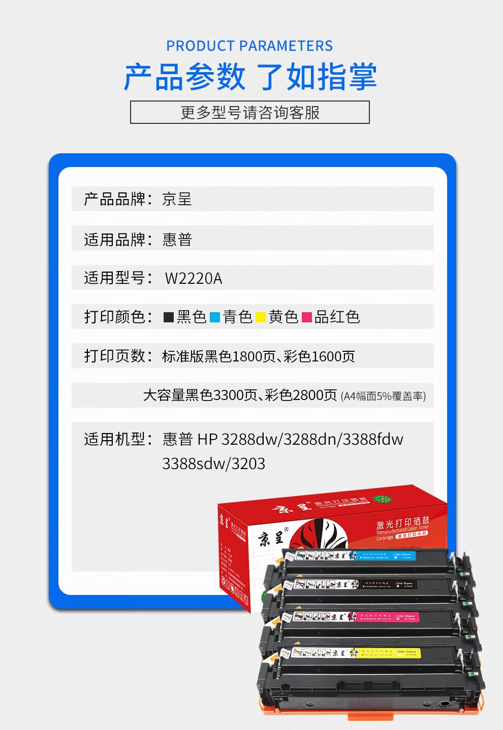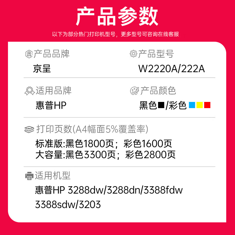 • 商品名称:京呈W2220A硒鼓适用惠普HP3288dw 3288dn 3388fdw 3388sdw 3203粉盒 222X 11700页 大容无芯片四色硒鼓套装 其他/套