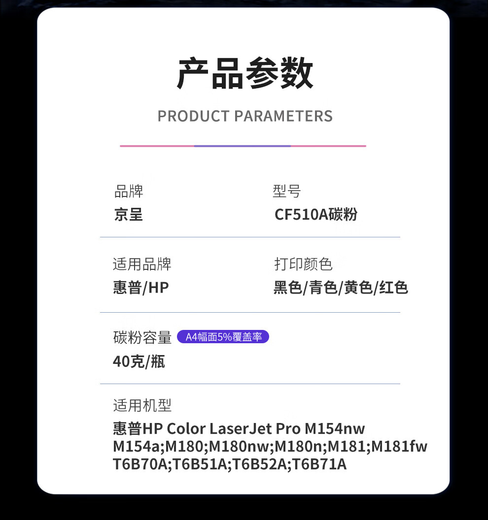 • 商品名称:京呈cf510a硒鼓适用惠普204a硒鼓m154a硒鼓m180 m180n m180nw m181 m181fw打印机碳粉盒墨盒m154nw墨粉碳粉 CF510/瓶