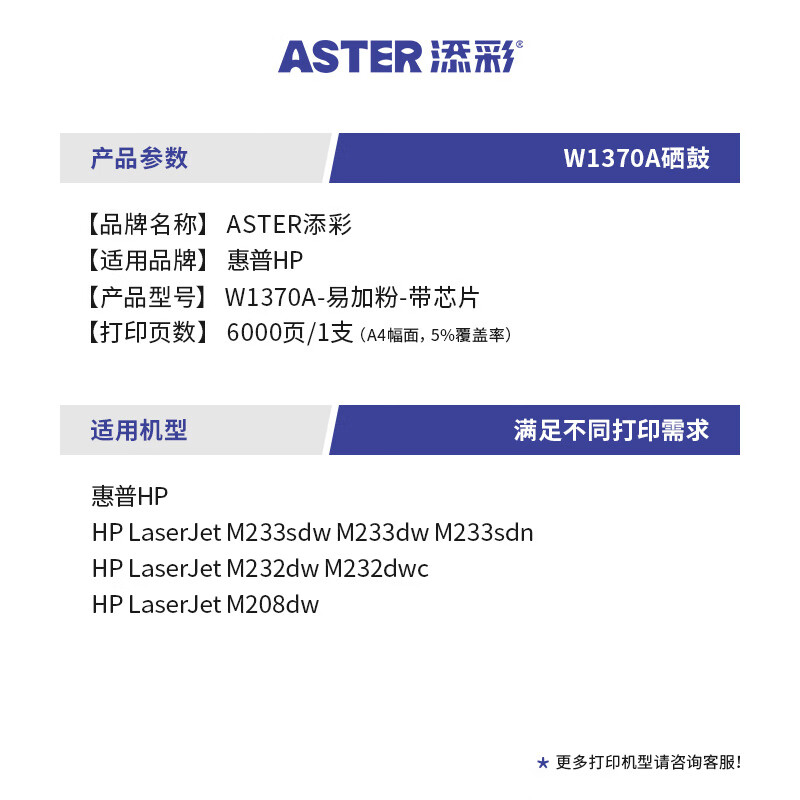 • 商品名称:添彩适用惠普m232dw硒鼓m233dw m233sdw硒鼓m232dwc m208dw m233sdn打印机墨盒w1370a hp137a硒鼓易加粉带芯片 W1370X/支