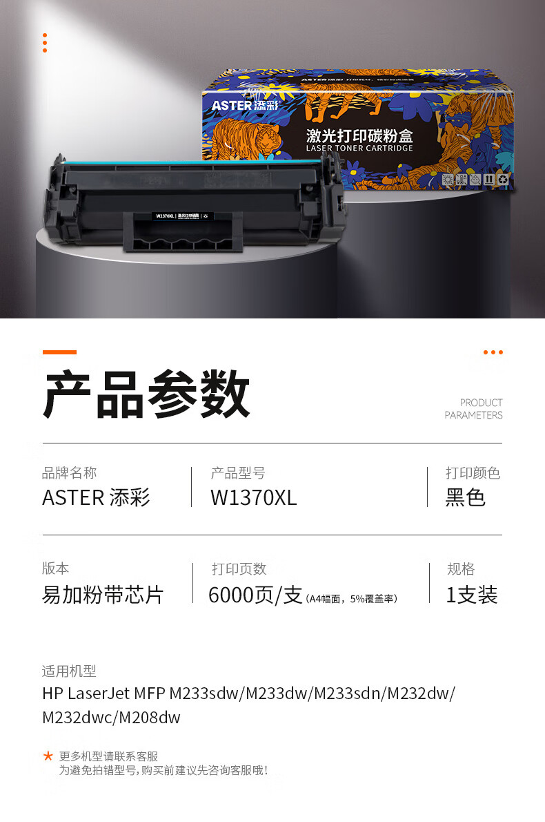 商品名称: 添彩适用惠普m232dw硒鼓m233dw m233sdw硒鼓m232dwc m208dw m233sdn打印机墨盒w1370a hp137a硒鼓易加粉带芯片 W1370X/支
