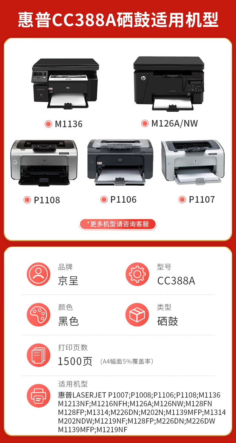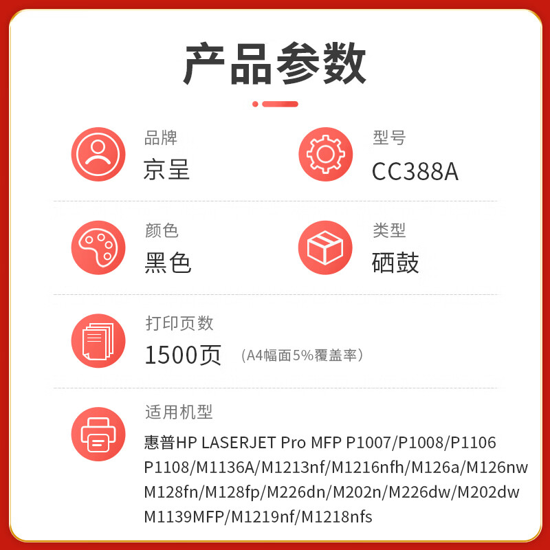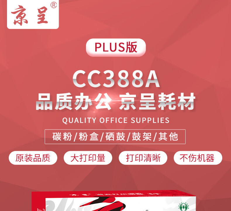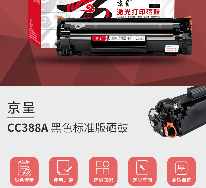 商品名称: 京呈PLUS版CC388A 88A硒鼓 适用惠普m1136 m126a P1108 P1106 m1213nf 88a硒鼓 【标准1500页】易加粉标准单支装 CC388A/支