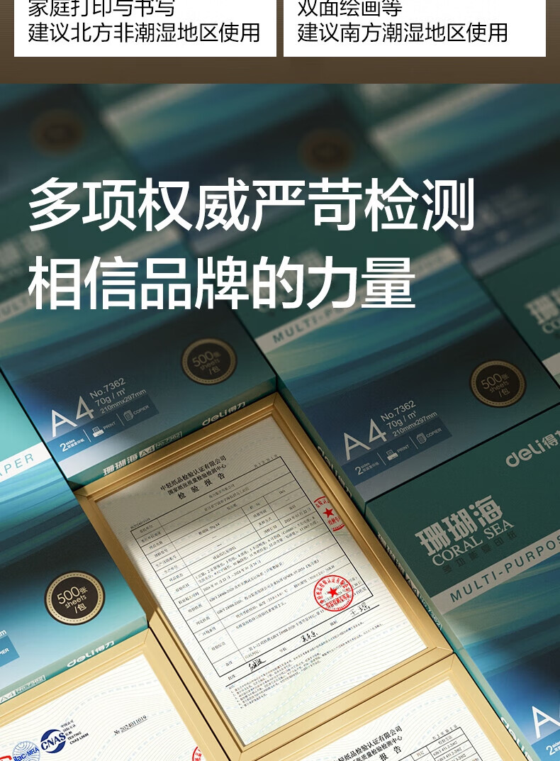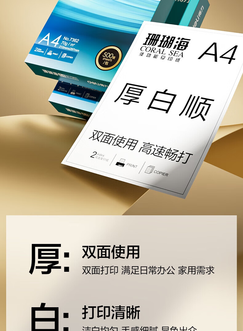 商品名称: 得力(deli)珊瑚海A4打印纸 70g500张*5包一箱 双面打印复印纸 整箱2500张7361 复印纸/箱