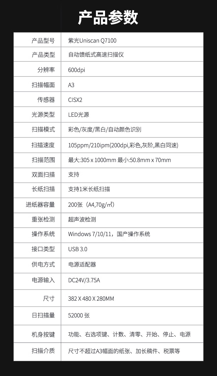 • 商品名称:紫光(UNIS)Uniscan Q7100 馈纸扫描仪 A3高速彩色自动双面U型扫描仪 支持国产系统 国保测认证 Uniscan Q7100/台