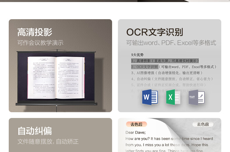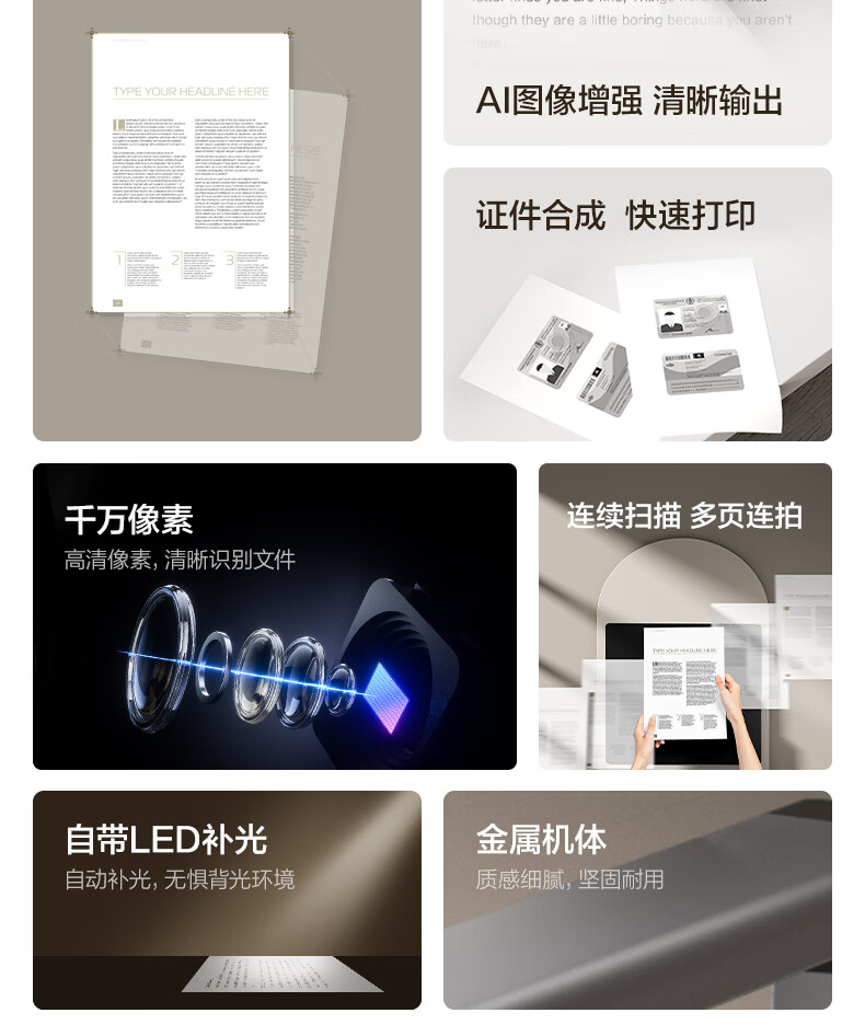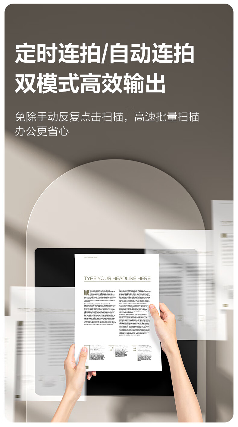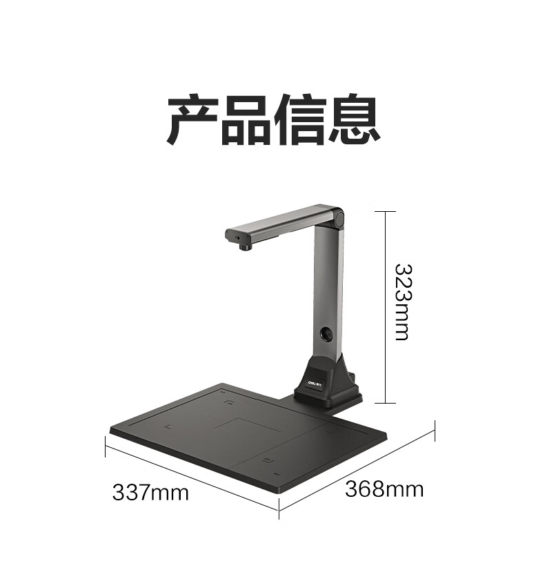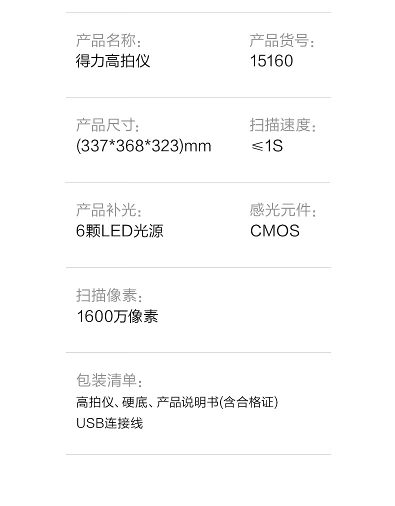 • 商品名称:得力 1600万像素高拍仪 自动连续扫描OCR文字识别AI增强算法纠偏 办公家用 金属机身 A4硬底15160 15160/台