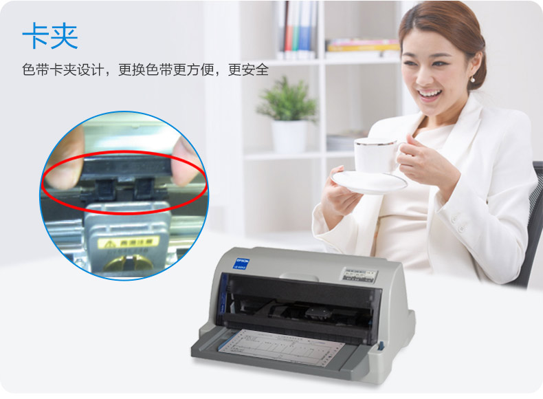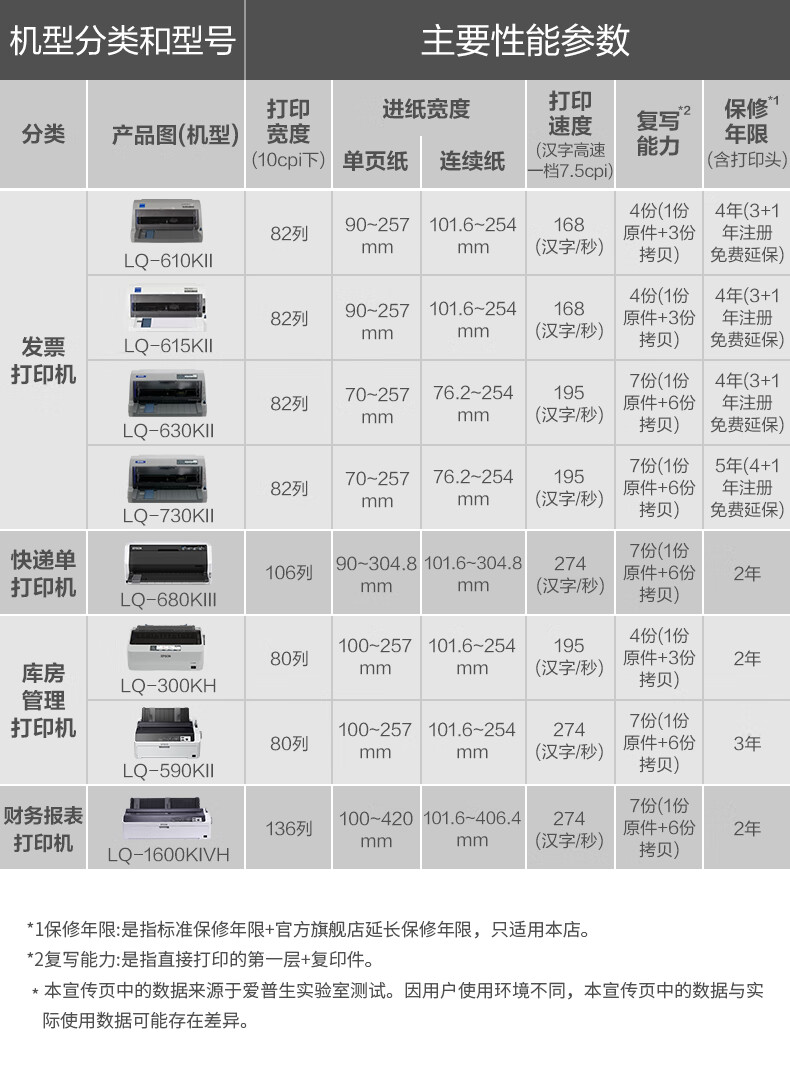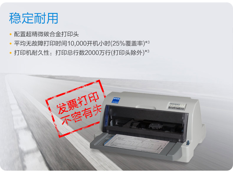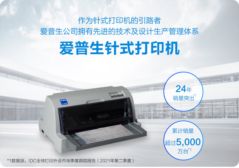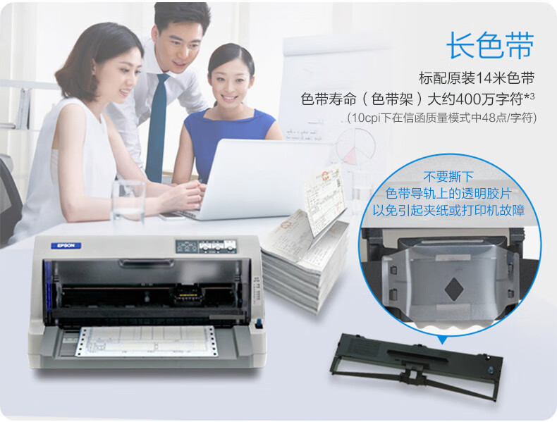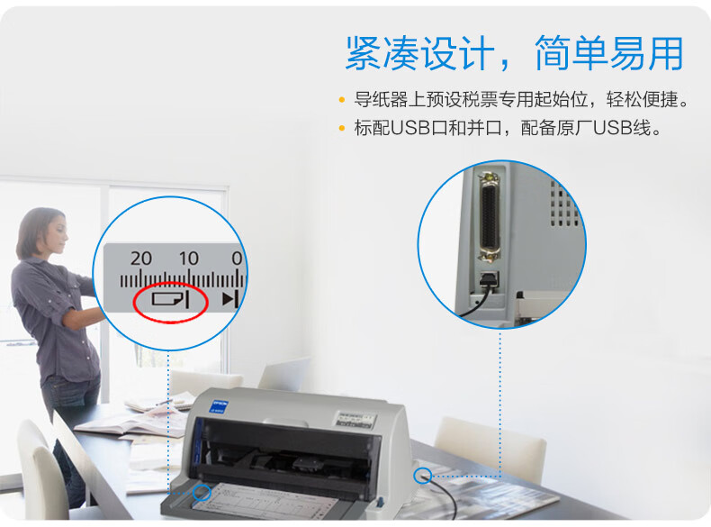 包装清单: 主机 × 1、电源线 × 1、USB线 × 1、说明书 × 1、保修卡 × 1、爱普生原装色带 × 1