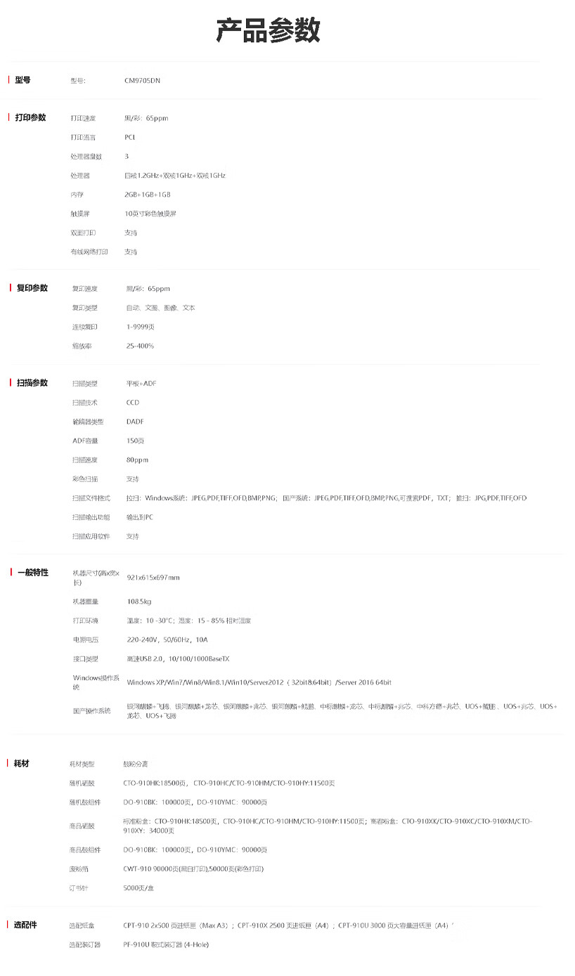 商品名称: 奔图(PANTUM)CM9705DN 全国产化彩色多功能数码复合机打印机 65ppm/自动双面(打印/复印/扫描) CM9705DN/个