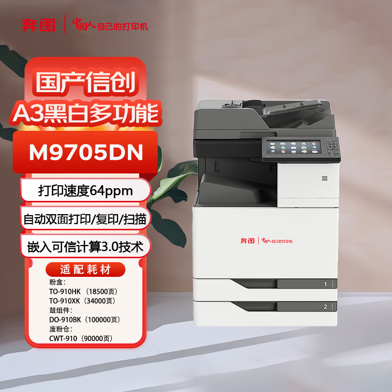 • 商品名称:奔图打印机 A3激光黑白打印机/扫描仪/复印机 10英寸彩色触摸屏自动双面打印 M9705DN M9705DN/台