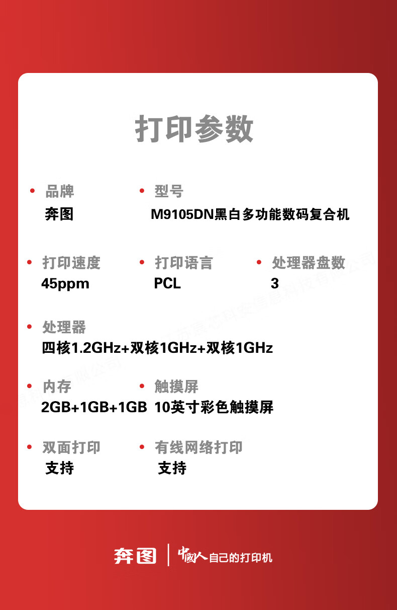 • 商品名称:奔图打印机 A3激光黑白打印机/扫描仪/复印机 10英寸彩色触摸屏自动双面打印 M9105DN M9105DN/台