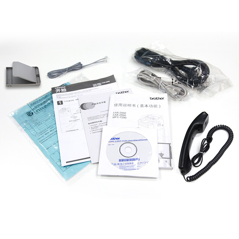包装清单: FAX-2890*1、随机安装光盘*1、交流电源线*1、使用说明书(基本功能)*1、快速安装指南*1、电话线*1、产品安全手册*1、USB接口电缆*1、自动进稿器原稿输出托板*1、电话听筒*1、听筒线*1