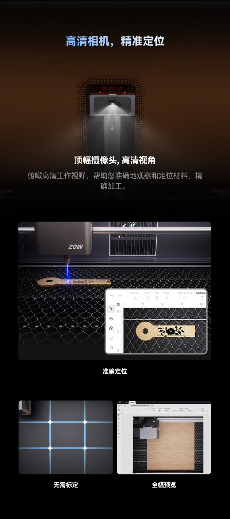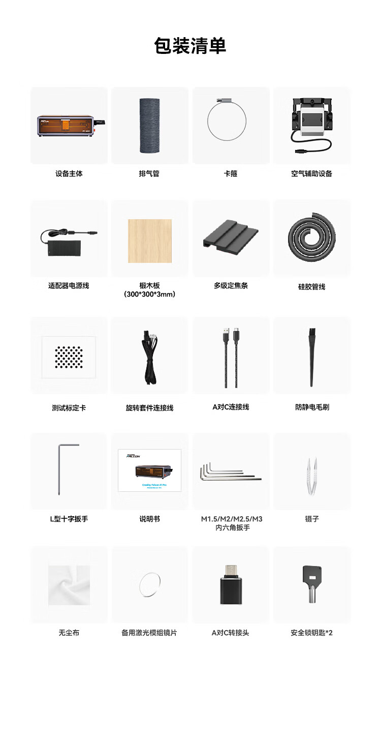 包装清单: 主机*1,空气辅助设备*1,排气管*1,硅胶管线*1,防静电毛刷*1,卡箍*1,适配器电源线*1,椴木板(300*300*3mm),多级定焦条*1,测试标定卡*1,旋转套件连接线*1,A对C连接线*1,L型十字扳手*1,M1.5/M2/M2.5/M3内六角扳手各一把,镊子*1,无尘布*1,备用激光模组镜片*1,A对C转接头*1,安全锁钥匙*2