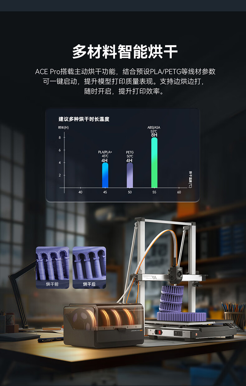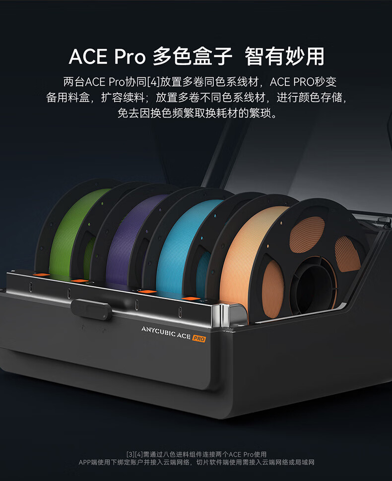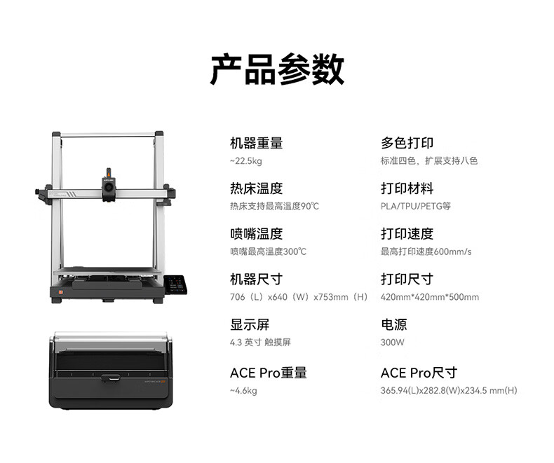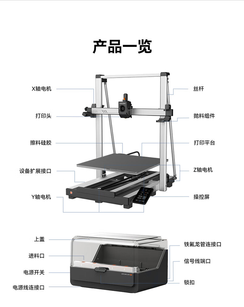 包装清单: 打印机、打印机底座、打印头、屏幕、耗材料架、线卡、ACE pro、螺丝、U盘、电源线、集线器、铁氟龙管、信号线、喷嘴清理器、测试耗材、润滑脂、开口扳手