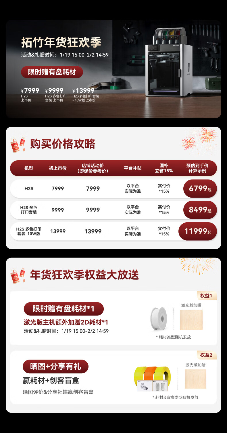 商品名称: 拓竹H2SC 多色套装3D打印机器大尺寸 高精度高速智能多色新品【大陆版】 H2SC/台