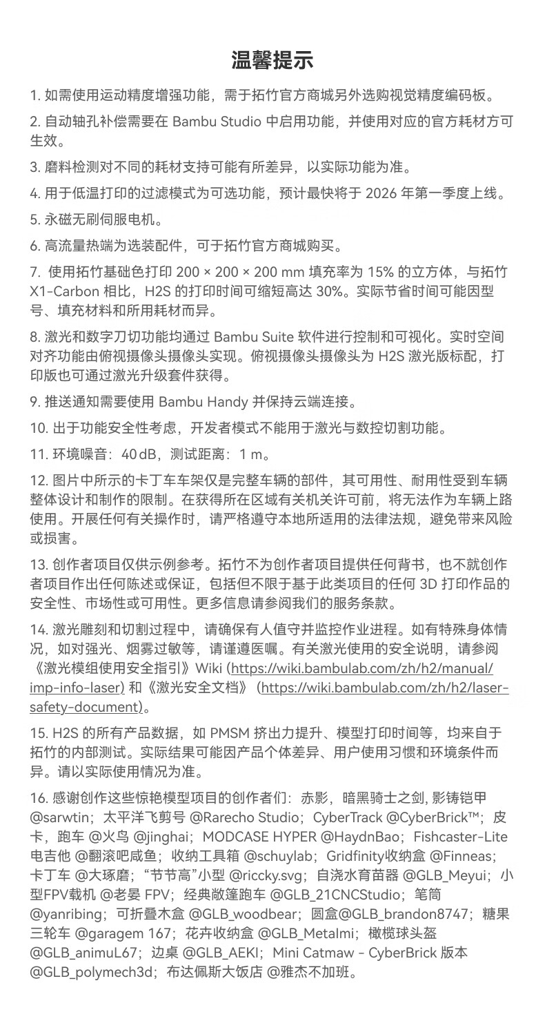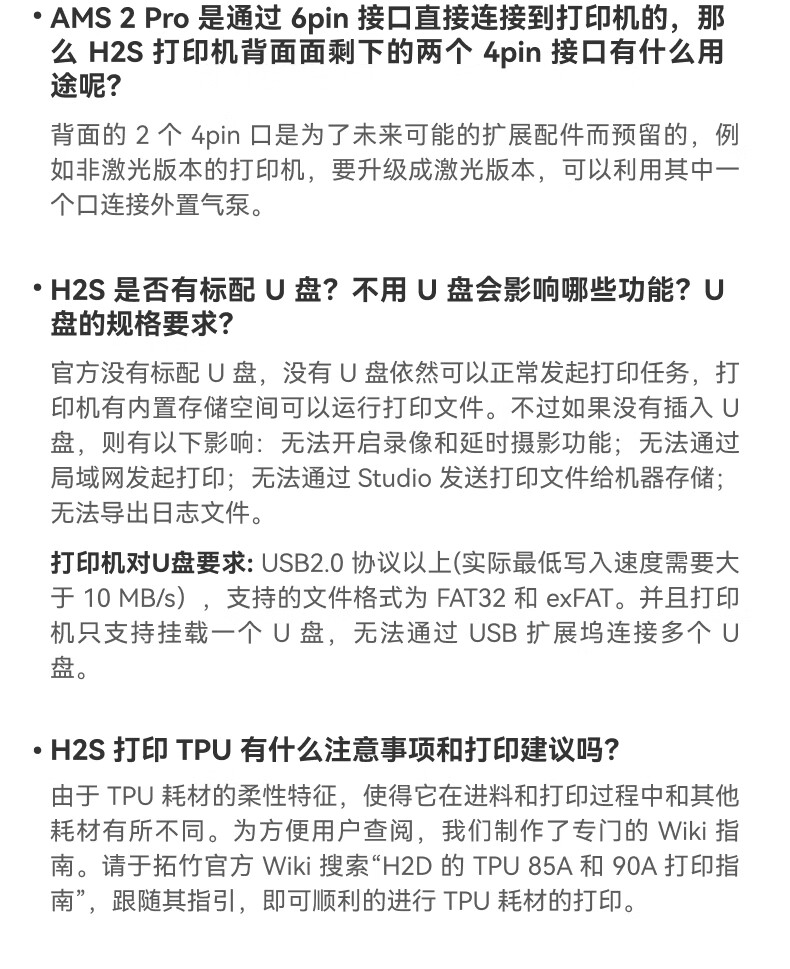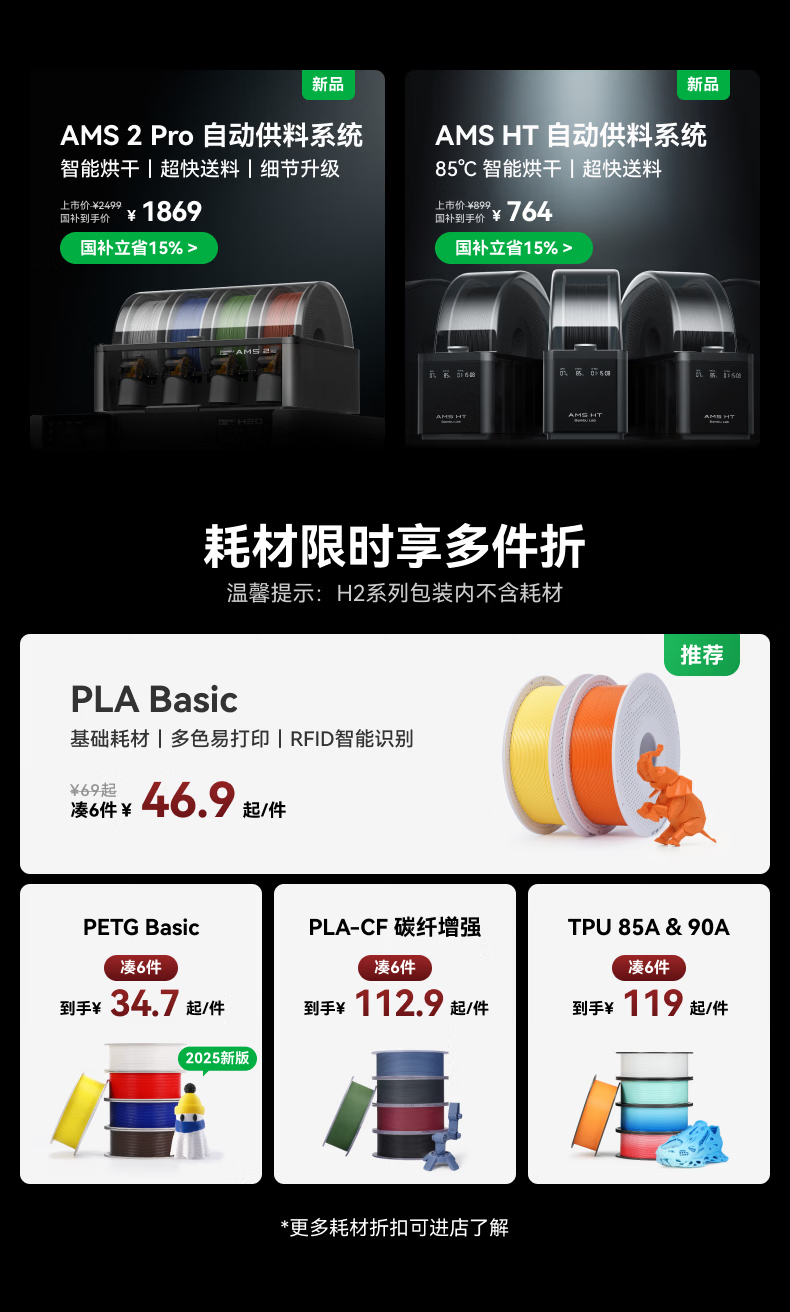 包装清单: 机器显示屏,H2SC打印机,AMS 2 Pro,打印板,工具盒,料架,安全钥匙等。详情可咨询客服或查询官方wiki。