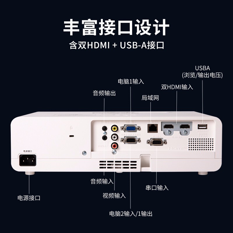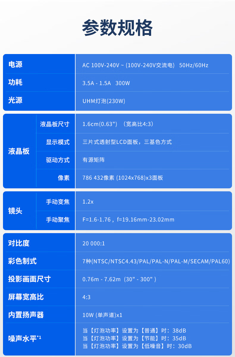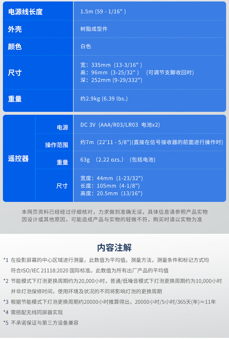包装清单: 投影机x1,无线遥控器单元x1,电源线x1,使用说明书x1,保修卡x1,电池(R03/LR03/AAA型)x 2