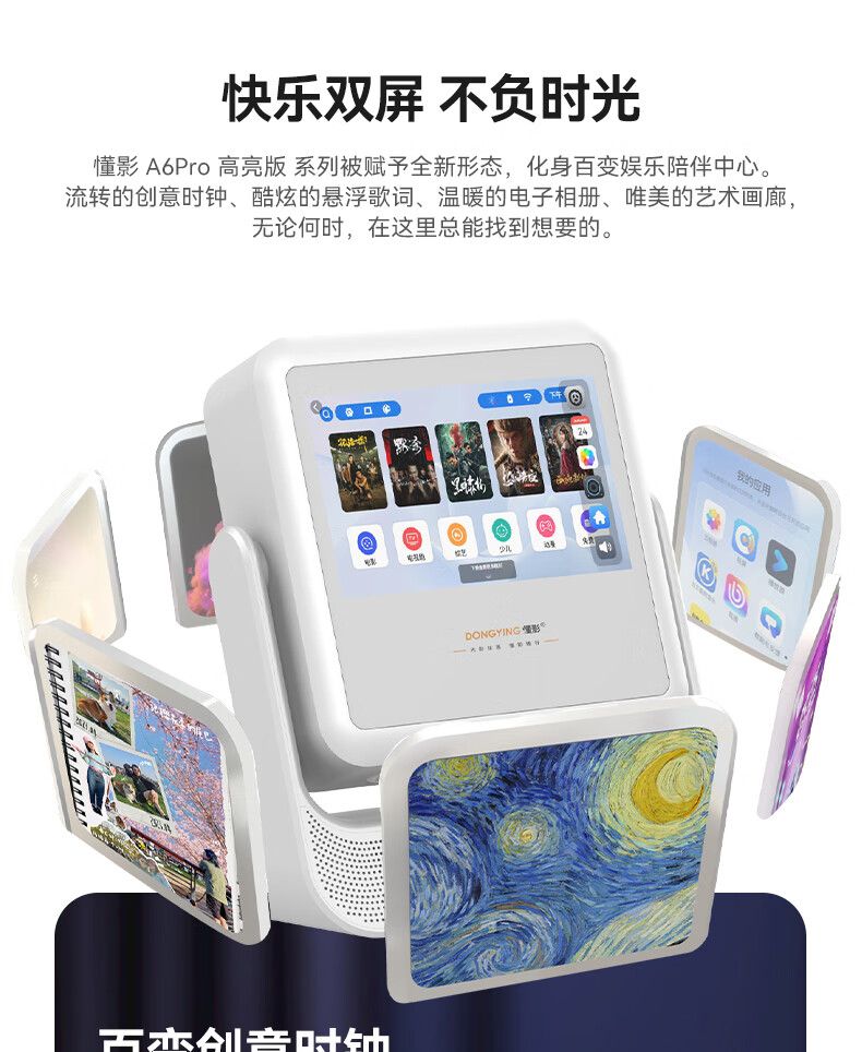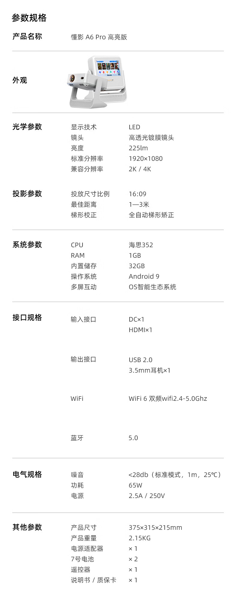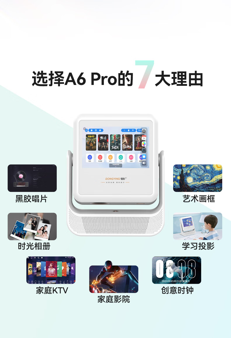 • 商品名称:懂影A6Pro全新升级 全密闭直投机 双屏触控家用投影仪 高清大屏家庭影院学生宿舍一体式云台 自动对焦 A6Pro/台