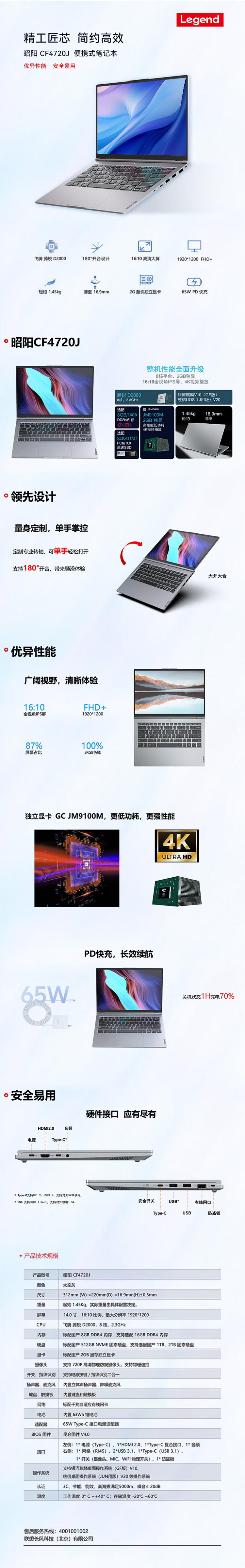 商品名称: 联想(Lenovo)CF4720J笔记本电脑14英寸D2000/8G/512G/4G独显/GF麒麟版/3年保修 CF4720J/台