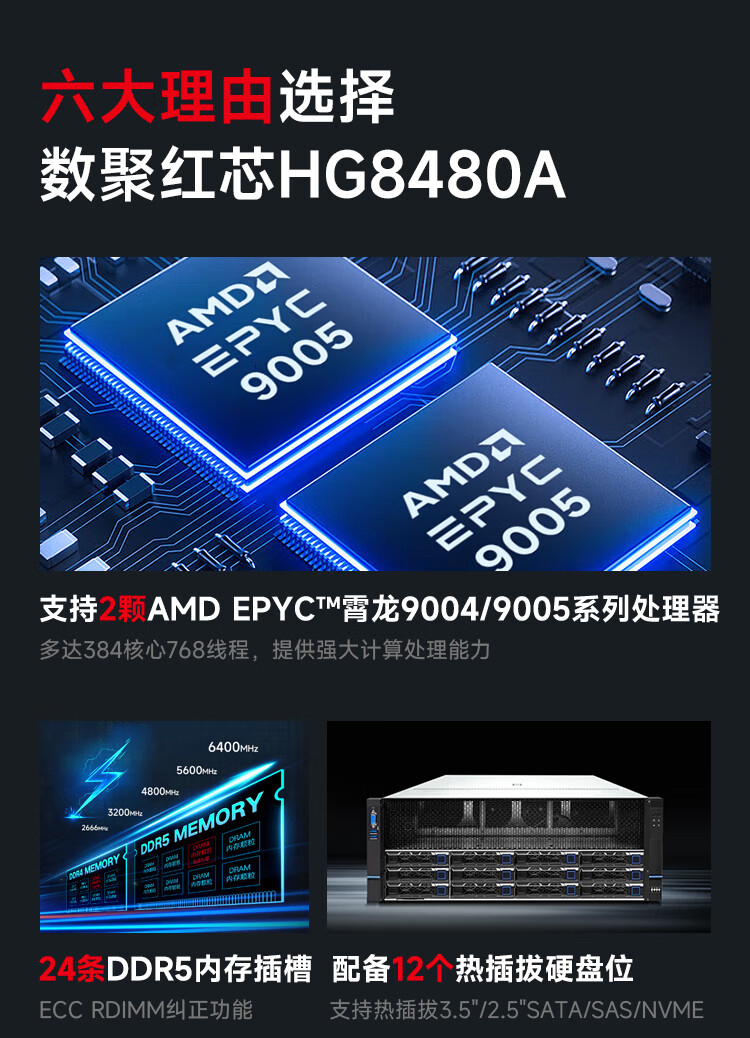 数聚红芯【HG8480A】2*AMD9555/576G内存/2*960G固态/4*3.84T固态/1G/4*2700W/三年上门服务 HG8480A/台