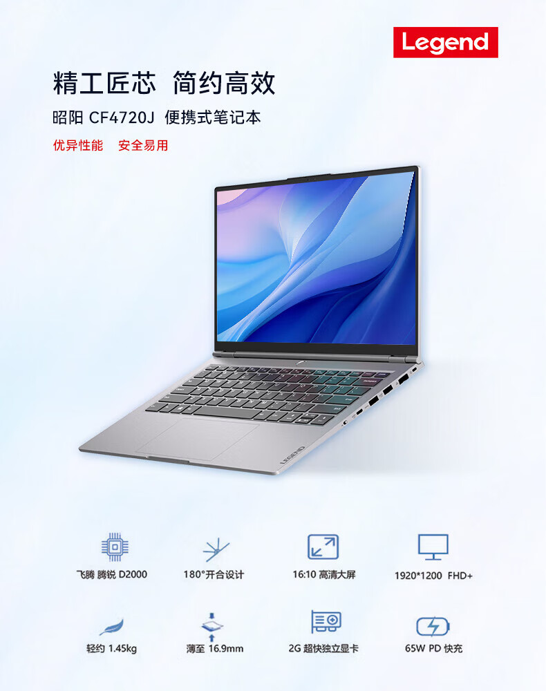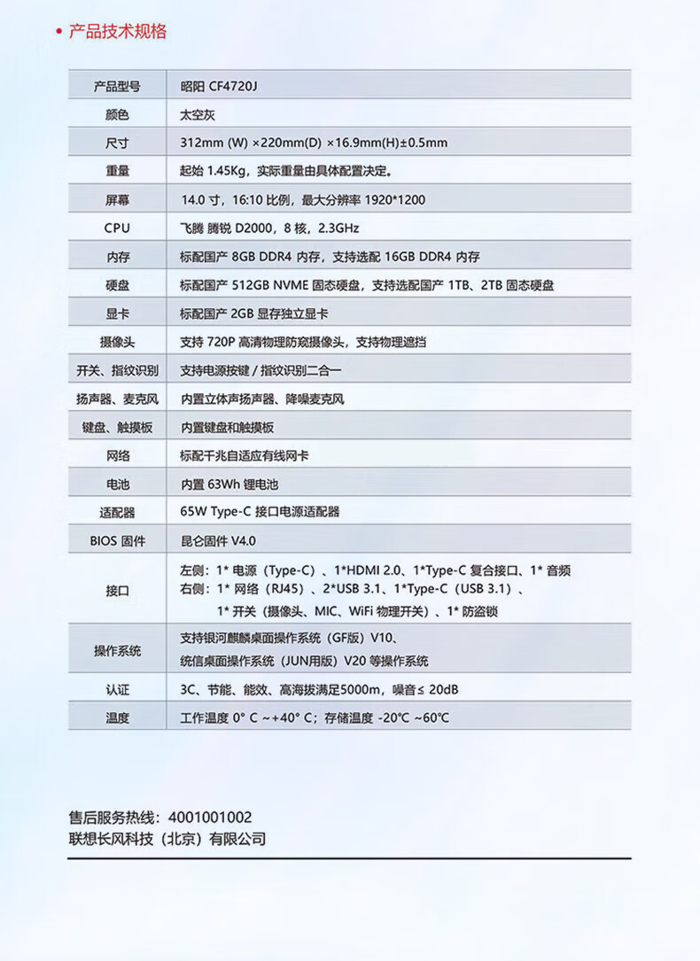 商品名称: LenovoLenovo昭阳CF4720J笔记本飞腾D2000 16G/512G /2G独显麒麟试用 联想/台