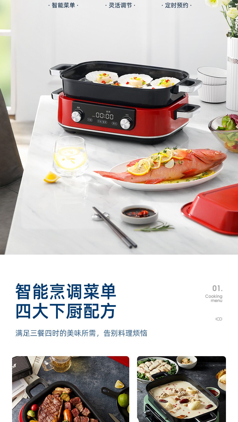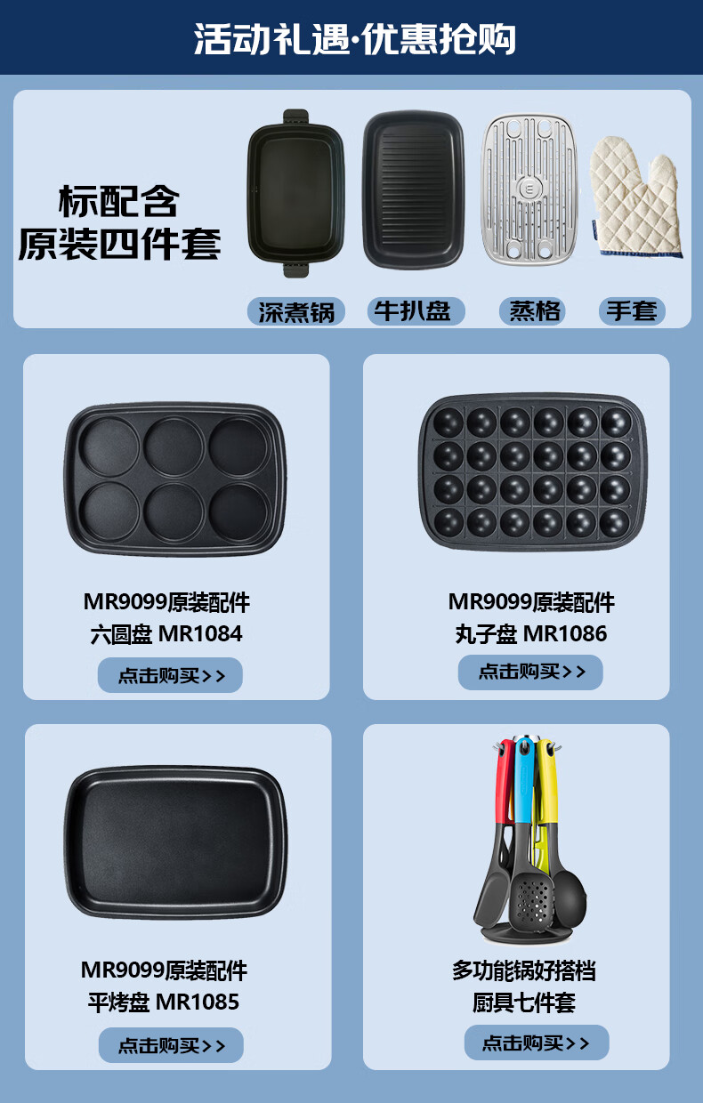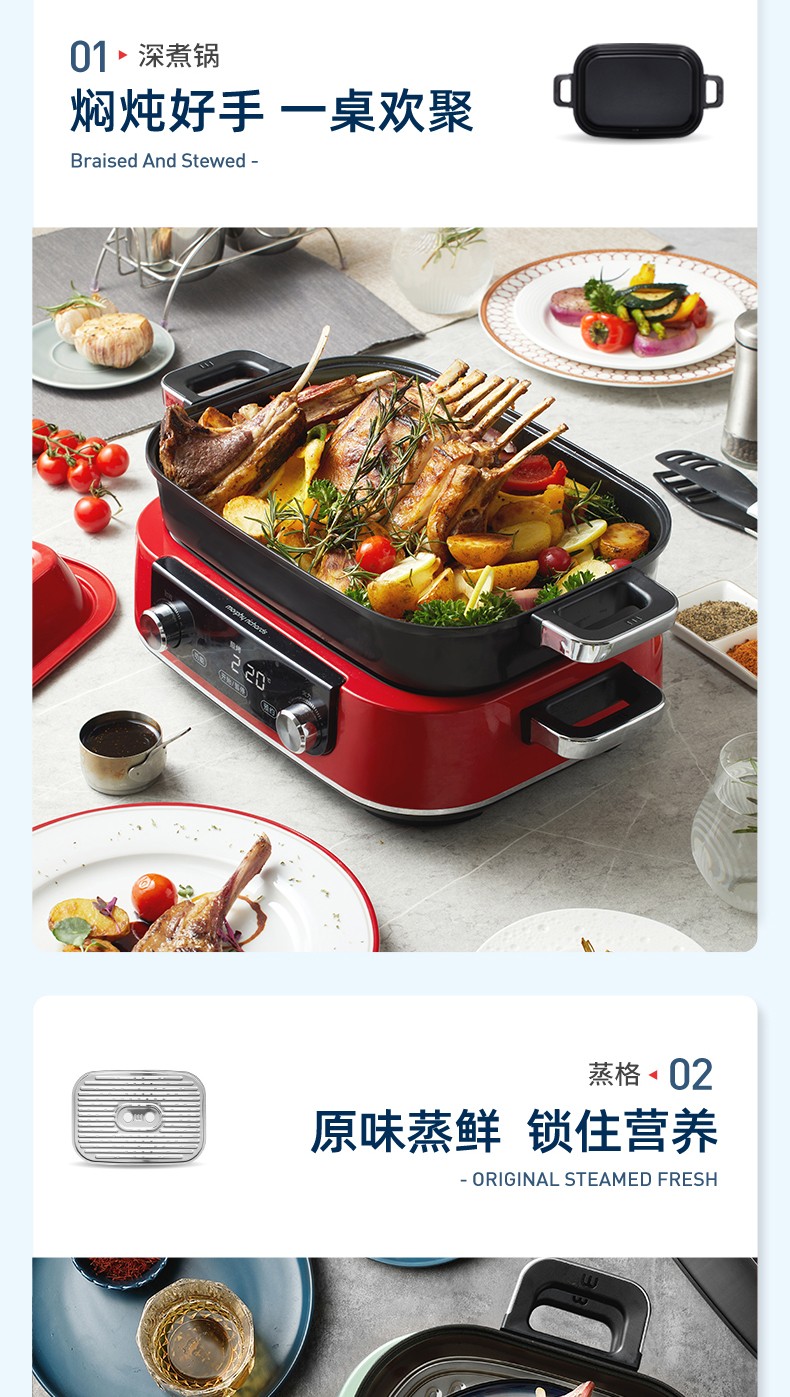 包装清单: 主机*1、深煮锅*1、蒸格*1、牛扒盘*1 、防烫手套*1、说明书*1