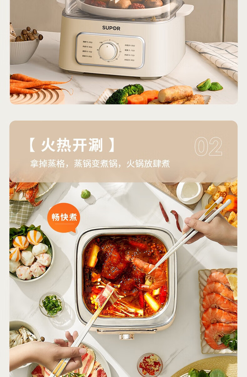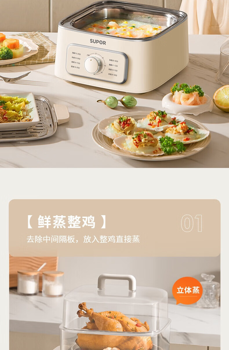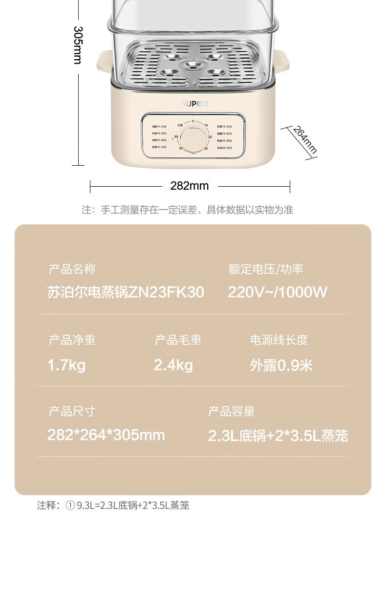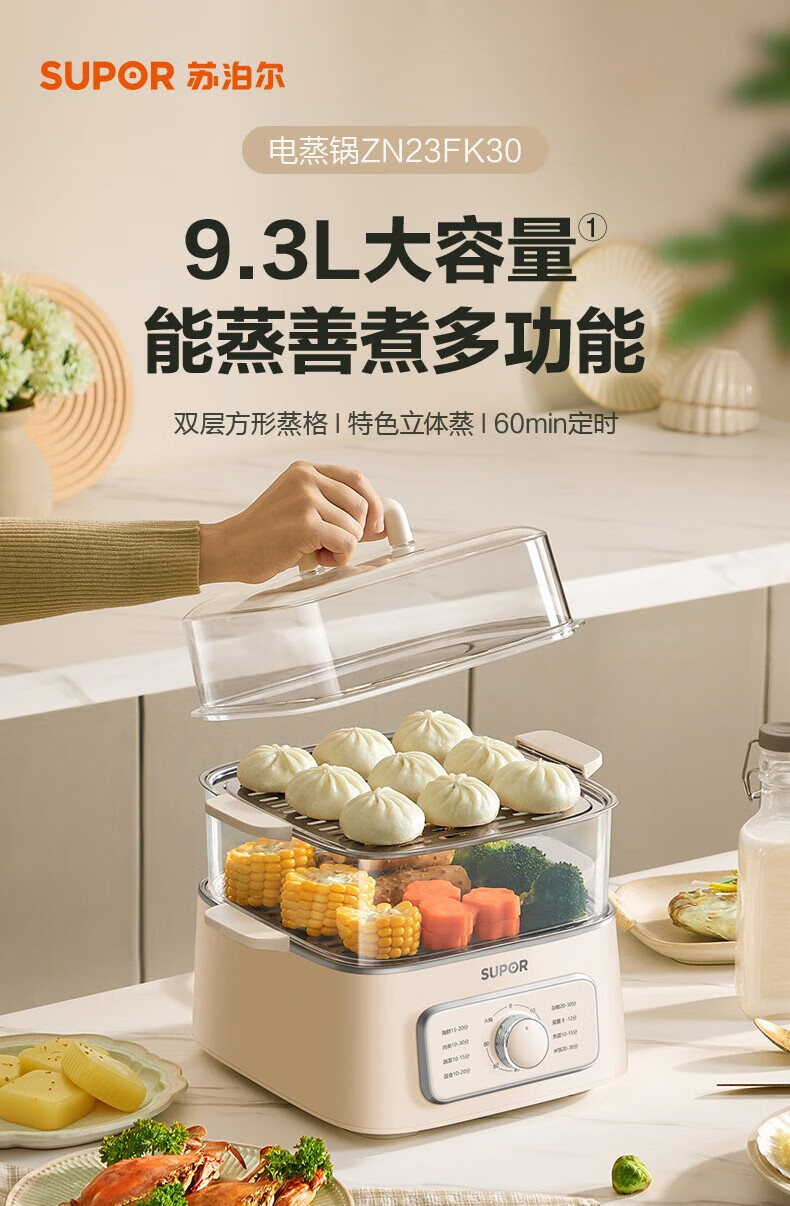 • 商品名称:苏泊尔电蒸锅电煮锅电火锅家用电锅蒸包子锅电热锅三层大容量多用途锅多功能锅ZN23FK30 ZN23FK30/个