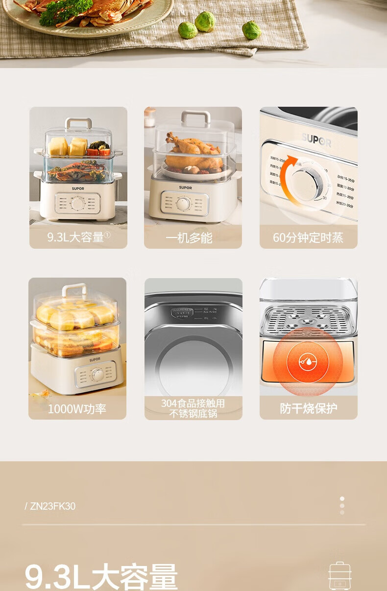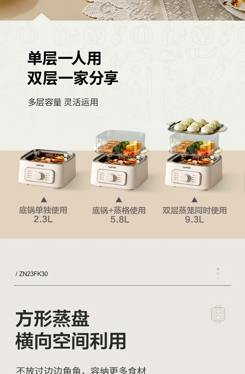 家用电器  > 厨房小电  > 多功能锅  >  苏泊尔/SUPOR  >  苏泊尔电蒸锅电煮锅电火锅家用电锅蒸包子锅电热锅三层大容量多用途锅多功能锅ZN23FK30 ZN23FK30/个