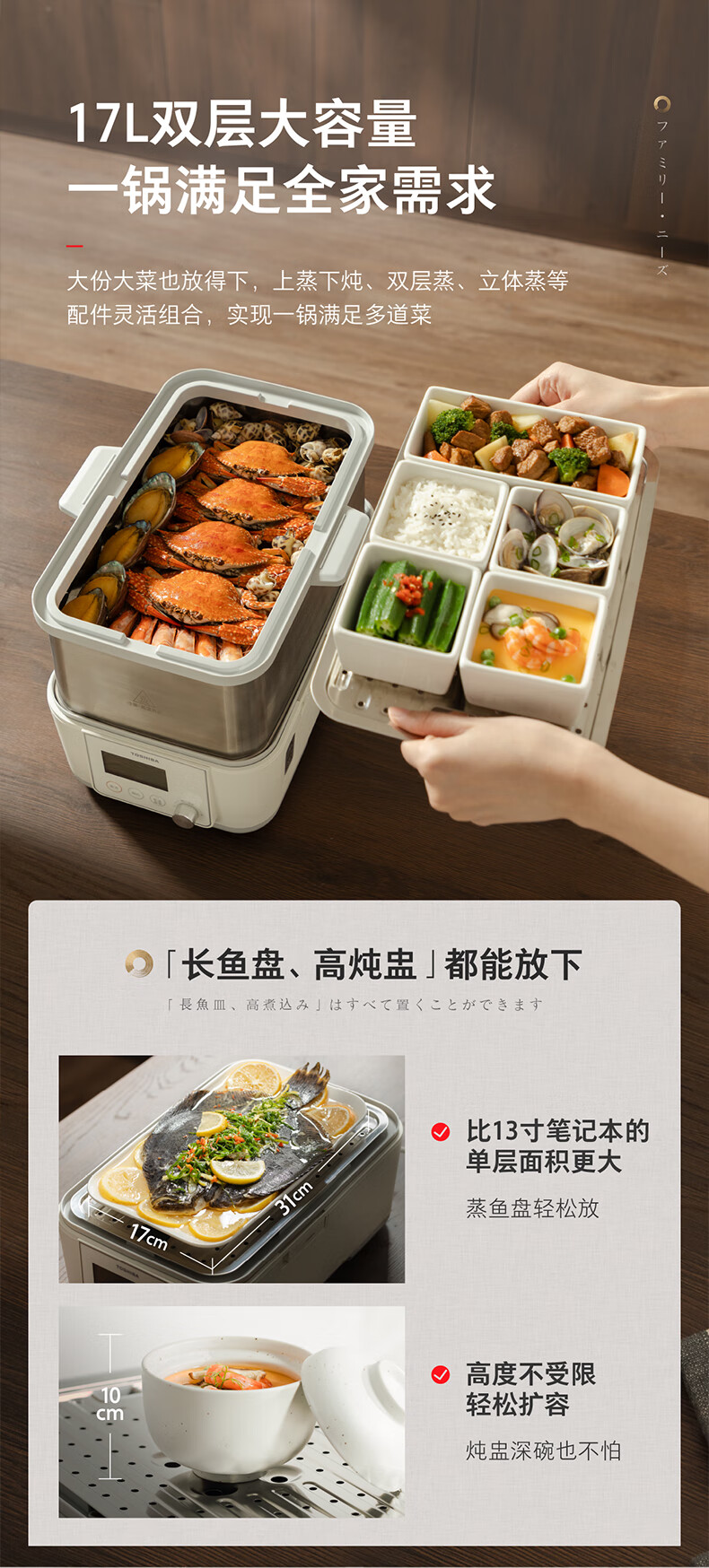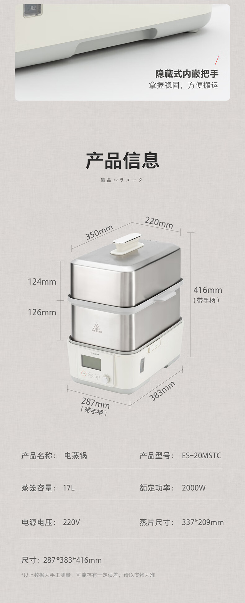 • 商品名称:东芝(TOSHIBA)芝味蒸电蒸锅家用双层大容量蒸汽锅全自动婴儿适用炖蒸煮一体多功能锅 ES-20MSTC ES-20MSTC/台