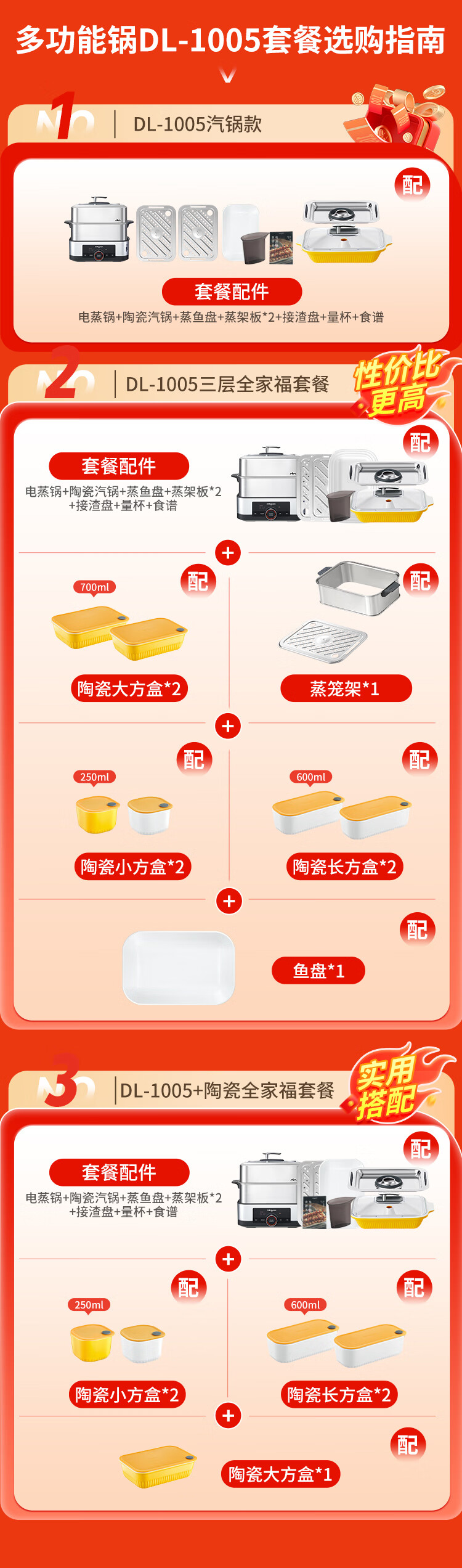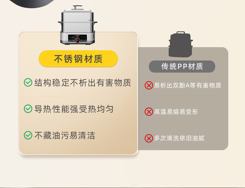 包装清单: 外包装箱*1,主机*1,接渣盘*1,下蒸笼*1,上蒸笼*1,蒸汽锅盖*1,蒸架板*2,蒸鱼盘*1,蒸汽锅*1,说明书*1,电源线*1,量杯*1