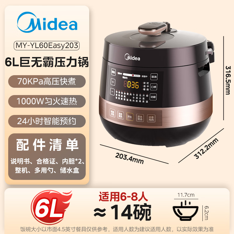 美的(Midea)品牌官方全自动智能预约电压力锅6L大容量家用双胆煲汤电饭煲60Easy203多功能高压锅4-6人 MY-YL60Easy203/台
